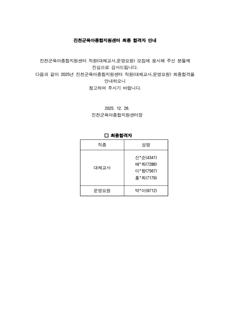 ÁøÃµ±ºÀ°¾ÆÁ¾ÇÕÁö¿ø¼¾ÅÍ Á÷¿ø ÃÖÁ¾ ÇÕ°ÝÀÚ ¾È³»