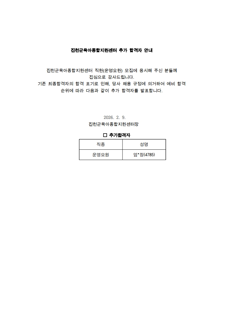 ÁøÃµ±ºÀ°¾ÆÁ¾ÇÕÁö¿ø¼¾ÅÍ ¿î¿µ¿ä¿ø(¾¦¾¦Àå³°¨µµ¼°ü) Ãß°¡ ÇÕ°ÝÀÚ ¾È³»
