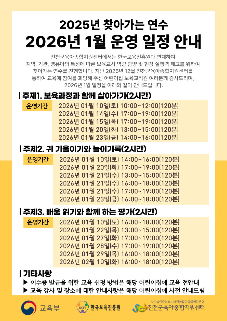 [¾î¸°ÀÌÁýÁö¿ø»ç¾÷] 2025³â °³Á¤Ç¥Áغ¸À°°úÁ¤(0-2¼¼) ÈļÓÁ¶Ä¡ ã¾Æ°¡´Â ¿¬¼ö 1¿ù ±³À° ÀÏÁ¤ ¾È³»