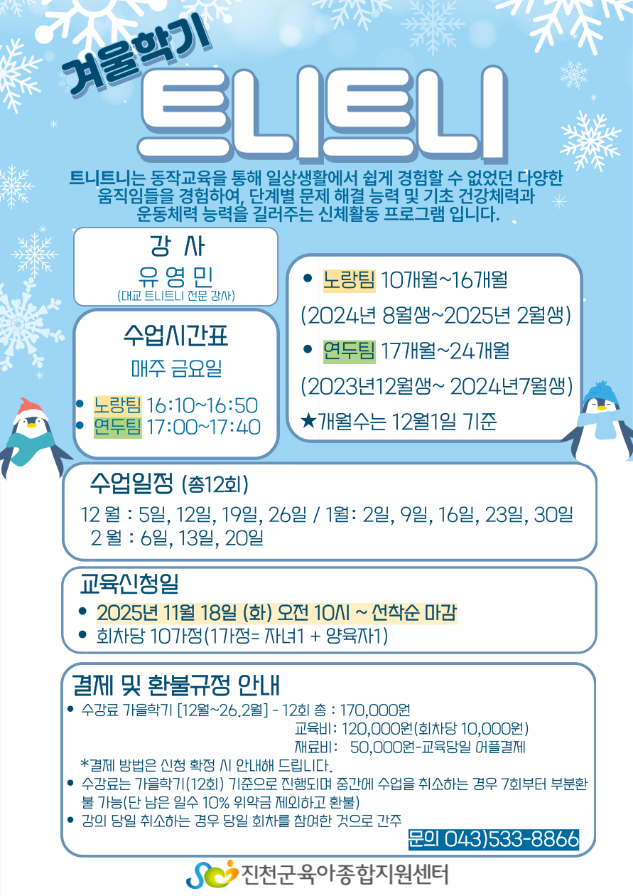 <½Åû°ü·Ã ¾È³»> * 2025 °Ü¿ïÇÐ±â Æ®´ÏÆ®´Ï ½Åû±â°£ : 11¿ù 18ÀÏ(È) 10½Ã~ ¼±Âø¼ø ¸¶°¨ * ¼ö¾÷½Ã°£ ¹× ¿¬·É : - ³ë¶ûÆÀ 16:10~16:50 (24³â 8¿ù 1ÀÏ~25³â 2¿ù 28ÀÏ»ý) - ¿¬µÎÆÀ 16:50~17:30 (23³â 12¿ù 1ÀÏ~24³â 7¿ù 31ÀÏ»ý) * ÆÀ´ç Á¤¿øÀº 10°¡Á¤(1°¡Á¤=¾çÀ°ÀÚ1+ÀÚ³à1)À̸ç 10°¡Á¤ Àü¿ø ½Åû ½Ã °³¼³µË´Ï´Ù. * ¼ö¾÷ ¹× ¼ö°·á °ü·Ã ³»¿ëÀº 043-533-8866 À¸·Î ¹®ÀÇÁֽñ⠹ٶø´Ï´Ù.