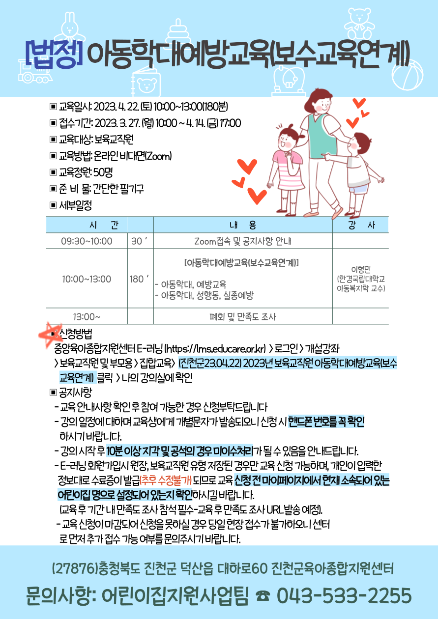> º¸À°±³Á÷¿ø ¹× ºÎ¸ð¿ë > ÁýÇÕ±³À°> (ÁøÃµ±º23.04.22) 2023³â º¸À°±³Á÷¿ø ¾Æµ¿Çд뿹¹æ±³À°(º¸¼ö