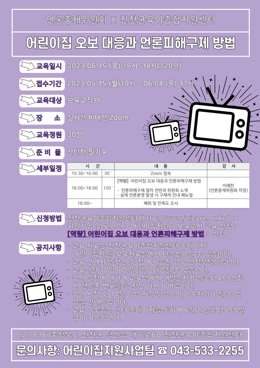 | ±âŸ»çÇ× | - ±³À° ÀÚ·á´Â ÁøÃµ±ºÀ°¾ÆÁ¾ÇÕÁö¿ø¼¾ÅÍ È¨ÆäÀÌÁö> ¾î¸°ÀÌÁýÁö¿ø>º¸À°ÀÚ·á½Ç¿¡¼ ´Ù¿î¹ÞÀ¸½Ç ¼ö ÀÖ½À´Ï´Ù. - ±³À° ¾È³»»çÇ× È®ÀÎ ÈÄ Âü¿© °¡´ÉÇÑ °æ¿ì ½ÅûºÎʵ右´Ï´Ù. - ±³À°Àοø 30¸í ¹Ì¾ÈÀÏ °æ¿ì Æó°µÉ ¼ö ÀÖ½À´Ï´Ù. - °ÀÇ ÀÏÁ¤¿¡ ´ëÇÏ¸ç ±³À°»ý¿¡°Ô °³º°¹®ÀÚ°¡ ¹ß¼ÛµÇ¿À´Ï ½Åû ½Ã ÇÚµåÆù ¹øÈ£¸¦ ²À È®ÀÎ ÇϽñ⠹ٶø´Ï´Ù. - °ÀÇ ½ÃÀÛ ÈÄ 10ºÐ ÀÌ»ó Áö°¢ÀÏ °æ¿ì ¹ÌÀ̼ö󸮰¡ µÉ ¼ö ÀÖÀ½À» ¾È³»µå¸³´Ï´Ù. - ±³À° À̼öÁõÀº ¼¾ÅÍ È¨ÆäÀÌÁö¸¦ ÅëÇÏ¿© 6¿ù 22ÀÏ(¸ñ)ºÎÅÍ ¹ß±ÞÀÌ °¡´ÉÇÕ´Ï´Ù. ¡Ú ÀúÀ۱ǹý¿¡ µû¶ó ±³À° Áß ±³À° ÀڷḦ ĸÃÄÇÏ¿© ¹«´ÜÀ¸·Î º¹Á¦ ¹× »ç¿ëÇÒ ¼ö ¾ø½À´Ï´Ù. |